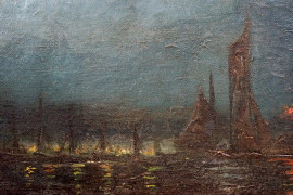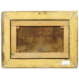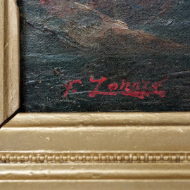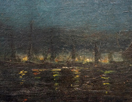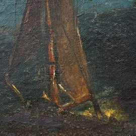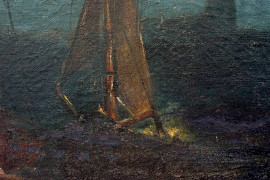 Veduta nottuna con imbarcazioni, olio su tela, firmato in basso a sinistra, cm 27x42, entro cornice.