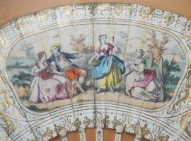 Ventaglio del XIX secolo, in carta con lumeggiature dorate e litografia dipinta a mano raffigurante nobildonne, entro ventagliera, ingombro cm 44.5x63.5, (difetti)