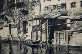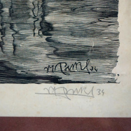 Vladim Pukl (1896-1970), Dopoledne v Čertovce, xilografia su carta, cm 50,5x36,5, entro cornice, (macchie)