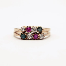 Anello in oro 14 kt con rubini, smeraldi e diamanti, misura n.15, peso gr.3,5
