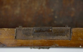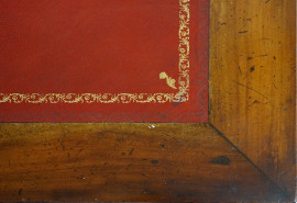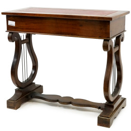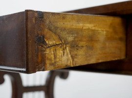 Basso tavolino in noce, XIX-XX secolo, piano con inserto in pelle, un cassetto nella fascia, montanti laterali a lira riuniti da traversa, cm h 71,5x81x38, (difetti)