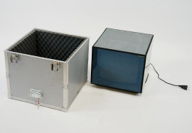 Brionvega, televisore cubo glass in cristallo a specchio, entro valigia in alluminio, cm h 38x28, (da revisionare).