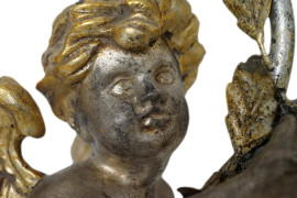 Coppia di sculture in legno e metallo argentato e dorato rappresentate due angeli, XX secolo, cm 29 (difetti)
