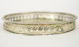 Due sotto bottiglia in argento con ringhiera traforata, punzoni sotto la base, cm 1x12, peso gr. 207, (difetti)
