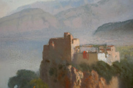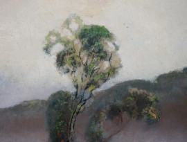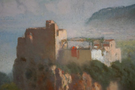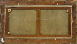 Eduardo Dalbono (Napoli, 10 dicembre 1841 – Napoli, 23 agosto 1915), Paesaggio, olio su tela, cm 60x123, entro cornice