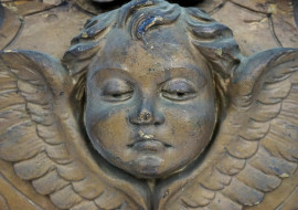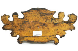 Fregio in legno scolpito e dorato raffigurante testa di putto, cm 50,5x25, XX secolo, (difetti)