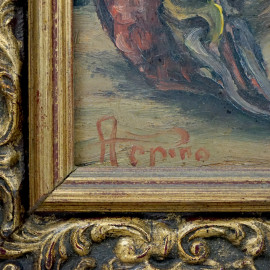 Natura morta-paiolo con patate, olio su cartone, cm 18x24, firmato, entro cornice