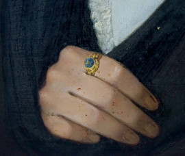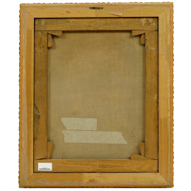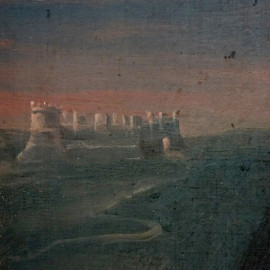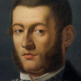 Ritratto virile con papillon a scacchi e castello sullo sfondo, XIX secolo, olio su tela, cm 64,4x51,4, entro cornice