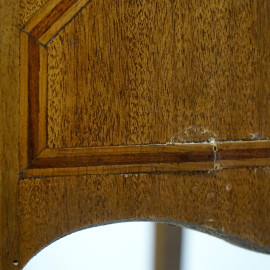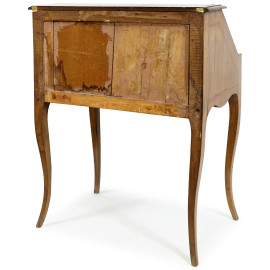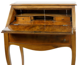 Scrittoio in legno impiallacciato, XX secolo, con piano a ribalta celante due cassettini e vani a giorno, un cassetto nella fascia, quattro gambe mosse, cm h 74x43x93, (difetti, mancanze)