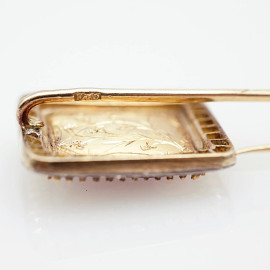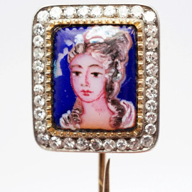 Spilla in oro 14 Kt con brillantini e miniatura rappresentante una figura femminile, cm 5, peso gr 6.7, (difetti)