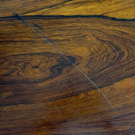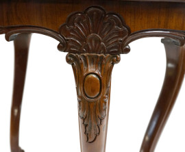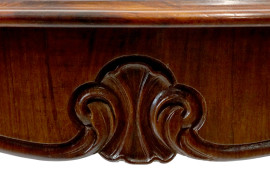 Tavolino di linea ovale in palissandro, XIX secolo, poggiante su quattro gambe mosse con particolari floreali intagliati, piedini a ricciolo, cm h 75x129x84, (segni del tempo).