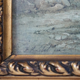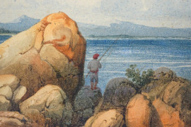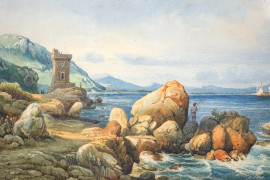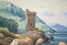 Veduta costiera con torre e pescatori, acquerello su carta, firmato "F. Knebel fece", cm 21x31, entro cornice