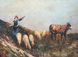 Al pascolo, olio su tela, firmato in basso a destra, cm 26,2x40, entro cornice (difetti)