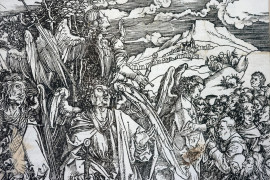 Albrecht Dürer (Norimberga 1471 - 1528), I quattro angeli trattengono i venti, dall'edizione del testo latino del 1511 de L'Apocalisse, xilografia, cm 39x26, entro cornice (margini tagliati, difetti e restauri)