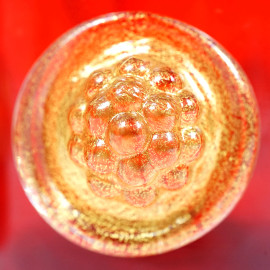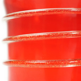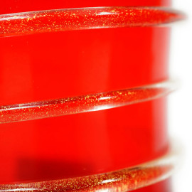 Sette grandi bicchieri in vetro soffiato di Murano, B&T El goto de fornase 2007, color rosso rubino con applicazioni in pasta di vetro trasparente con foglia d'oro, firma e data sotto la base, altezza cm 13, diametro cm 9