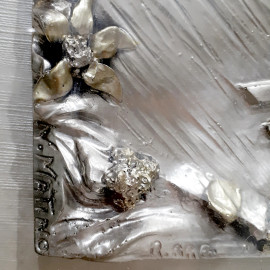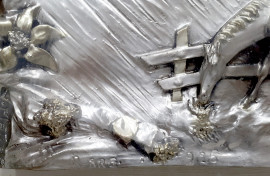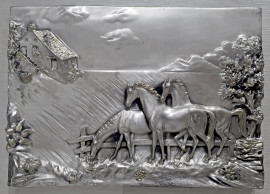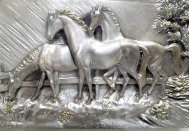 Bassorilievo placcato in argento 925 raffigurante cavalli al pascolo, cm 22x32, firmato, in elegante cornice