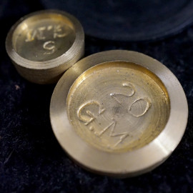 Bilancia da orafo in metallo dorato, da montato altezza cm 18, entro custodia