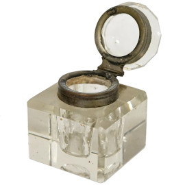 Calamaio in legno con boccette in cristallo e cassettino, fine XIX secolo, cm 8,5x21,5x34 (difetti)