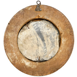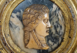 Clipeo in marmo africano con profilo femminile in marmo giallo, entro cornice in legno dorato, XVIII-XIX secolo, diametro cm 9 circa, entro cornice