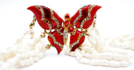 Collana girocollo a 9 fili di perle di fiume, con chiusura a forma di farfalla in metallo smaltato rosso e strass, lunghezza cm 47,5 (mancanze)