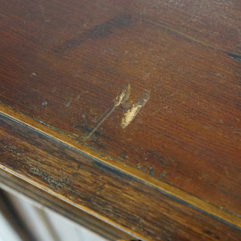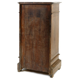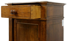Comodino in legno del XIX-XX secolo, fronte ad un cassetto e uno sportello centrato da monogramma inciso, piede a mensola, cm 88x33x46, (difetti)