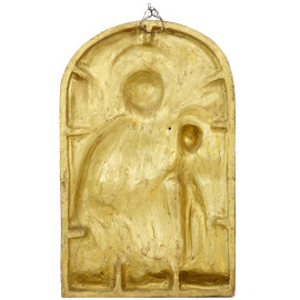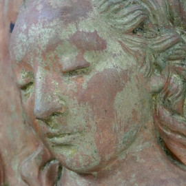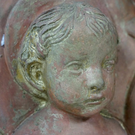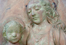 Copia da Andrea Verrocchio, Madonna con Bambino, bassorilievo in terracotta, cm 67x42,5, (difetti)