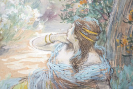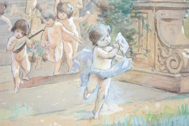 Figura femminile con putti musicanti entro una villa, acquerello su carta, firmato a destra C. Coppedè, cm 34,5x50,5, entro cornice