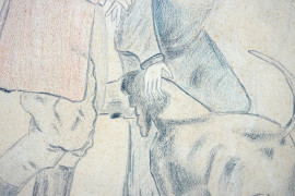 Coppia a passeggio con cane, matita e pastello su carta, cm 50x39, firmato, entro cornice