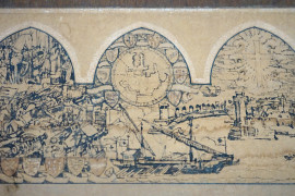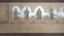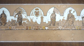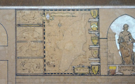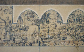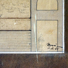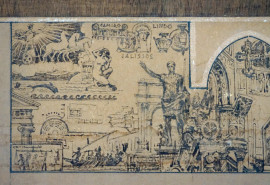 Coppia di disegni studi per una decorazione parietale, firmati e datati in basso a destra [...] [19]39 e [19]40, tecnica mista su carta applicata su compensato, misure max disegno cm 13,8x88,6, (difetti)