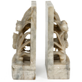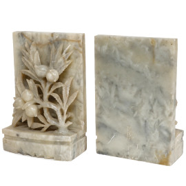 Coppia di fermalibri in pietra saponaria scolpita, decorati a motivi vegetali, Cina, XX secolo, cm 17,8x11,5x5,5 (difetti)
