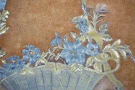 Decorazione in metallo dorato e argentato raffigurante un cestino con fiori, cm 28x22,5 circa, entro cornice circolare