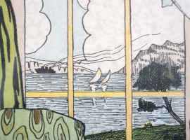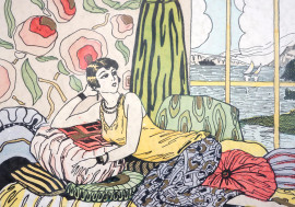 Distesa sul divano guarda la riva del mare, anni '30, stampa a pochoir, cm 26x26, entro cornice