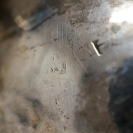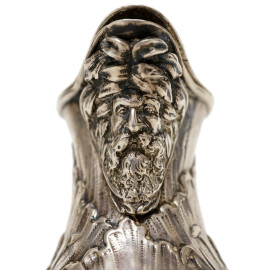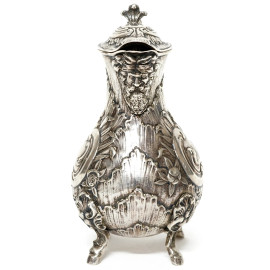 Egoiste in argento con decori sbalzati e cesellati, manico sagomato, poggiante su quattro piedini, punzoni non identificabili, altezza cm 18, peso gr. 349