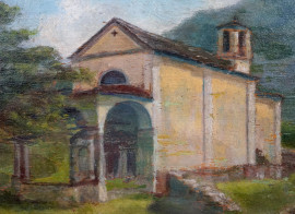 Esterno di chiesa, olio su tavola, firmato, cm 19x31, entro cornice