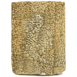 Fontana da parete in pietra decorata a bassorilievo con due delfini, XX secolo, cm 39x29x6 circa