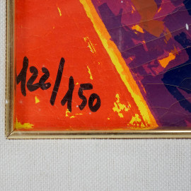 Frutta e verdura sul tavolo, serigrafia polimaterica a 36 passaggi di colore, esemplare numero 122/150, firmato in basso a destra A[thos] Faccincani, cm 84x53, entro cornice