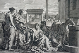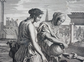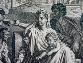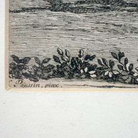 La Sacra Famiglia in Egitto, incisione da Nicolas Poussin, incisore Francois Chauveau (Parigi, 1613-1676), cm 40x50,5, entro cornice