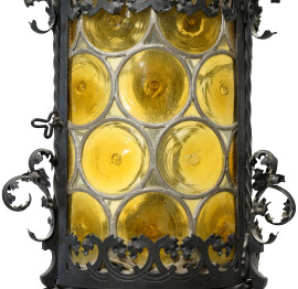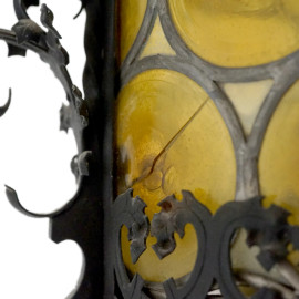 Lampada da terra in ferro battuto con laterna in vetro giallo piombato, anni '20/'30, altezza cm 210, (difetti)