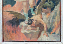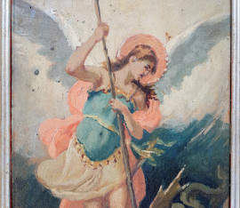 L'arcangelo Michele schiaccia il demonio, olio su tavoletta, siglato in basso a sinistra V.M., cm 13,9x8, entro cornice