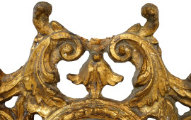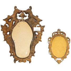 Lotto composto da due specchierine in legno intagliato e dorato, XX secolo, misura max cm 50x38 (difetti e rotture)