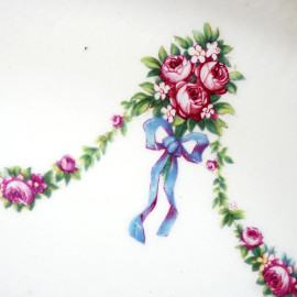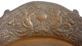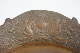 Lotto composto da un centro tavola ovale in metallo sbalzato con decori vegetali e figure e un vassoio in metallo dorato e porcellana con decori floreali, XX secolo, misura max cm 36x33
