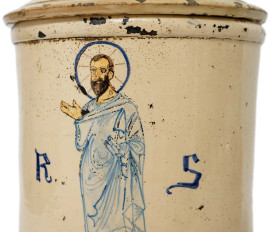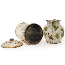 Lotto composto da una brocca ed un vaso da farmacia in ceramica smaltata e dipinta in policromia, manifatture diverse, XX secolo, misure max cm h 31 circa, (difetti)
