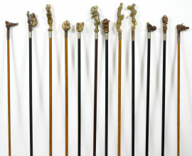 Lotto di 12 bastoni da passeggio in legno con prese a foggia di animali in materiali diversi, XX secolo, lunghezza max cm h 106, (difetti)