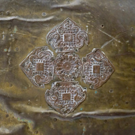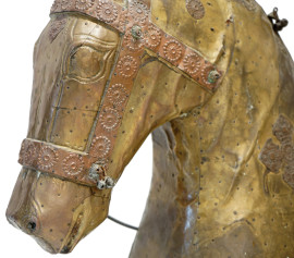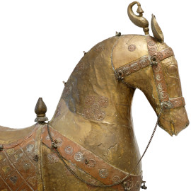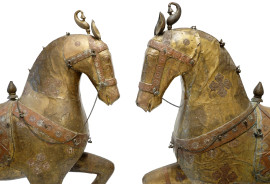 Lotto di due cavalli in legno e rame cesellato, arte orientale, XX secolo, cm 95x83 (difetti)