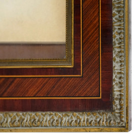 Lotto di due cornici in legno impiallacciato e intarsiato in varie essenze e metallo dorato, ingombro cm 38,5x29,5, battente cm 26,17 (difetti)