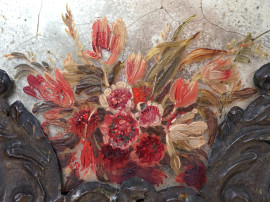 Lotto di tre cartaglorie in lamina sbalzata, due montate a specchio con decori floreali e una rappresentante una natura morta di fiori, olio su tavoletta, elementi di epoche diverse, misura max cm 49x39, (difetti)