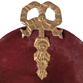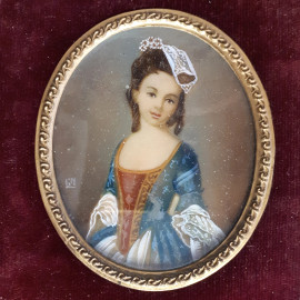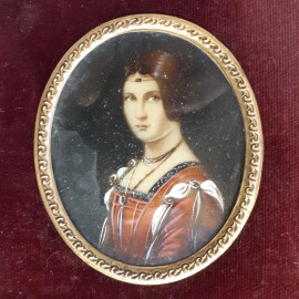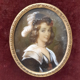 Lotto di tre eleganti miniature in cromolitografia finemente ritoccate a mano raffiguranti nobildonne, ciascuna racchiusa in cornice ovale in metallo sbalzato e dorato e montate in unico supporto rivestito in velluto rosso bordeau e raso moirè, cm 7x6 ciascuna miniatura e cm 41x10 l’intera composizio [..]