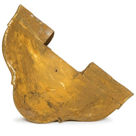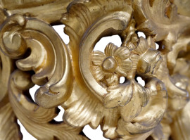Mensola in legno intagliato e dorato con decori a motivi a volute e floreali, XIX-XX secolo, cm 47x46,5x26,5 (difetti)