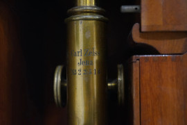 Microscopio Carl Zeiss Jena n. 22516, inizi XX secolo, cm h 32,5, entro custodia in legno, misure ingombro cm 37,5x18,5x21,5, (difetti e mancanze)