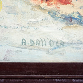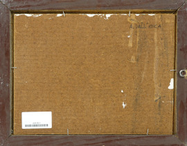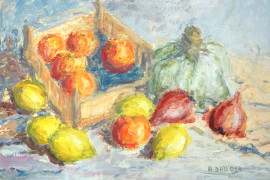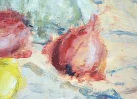 Natura morta di frutta, olio su cartone pressato, firmato in basso a destra, cm 23,2x30,5, entro cornice
